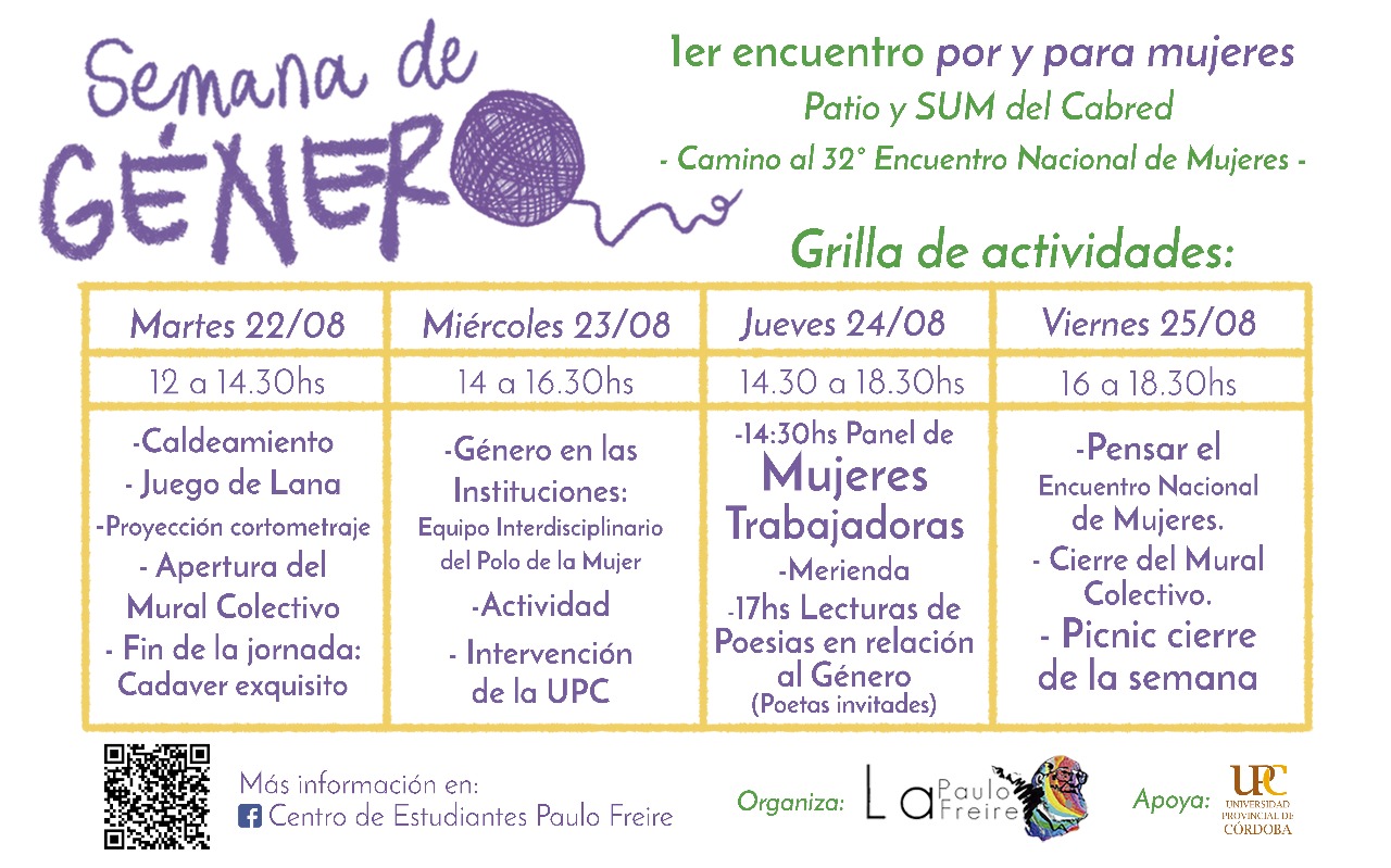 La propuesta es organizada y llevada a cabo por estudiantes del Instituto Cabred que integran el Centro de Estudiantes Paulo Freire. Las actividades son variadas y todas con entrada libre y gratuita. Se llevaran a cabo desde el martes 22 de agosto hasta el viernes 25 inclusive, en la sede Cabred ubicada en la calle Deodoro Roca S/N (frente al Monumento del Dante) Parque Sarmiento.