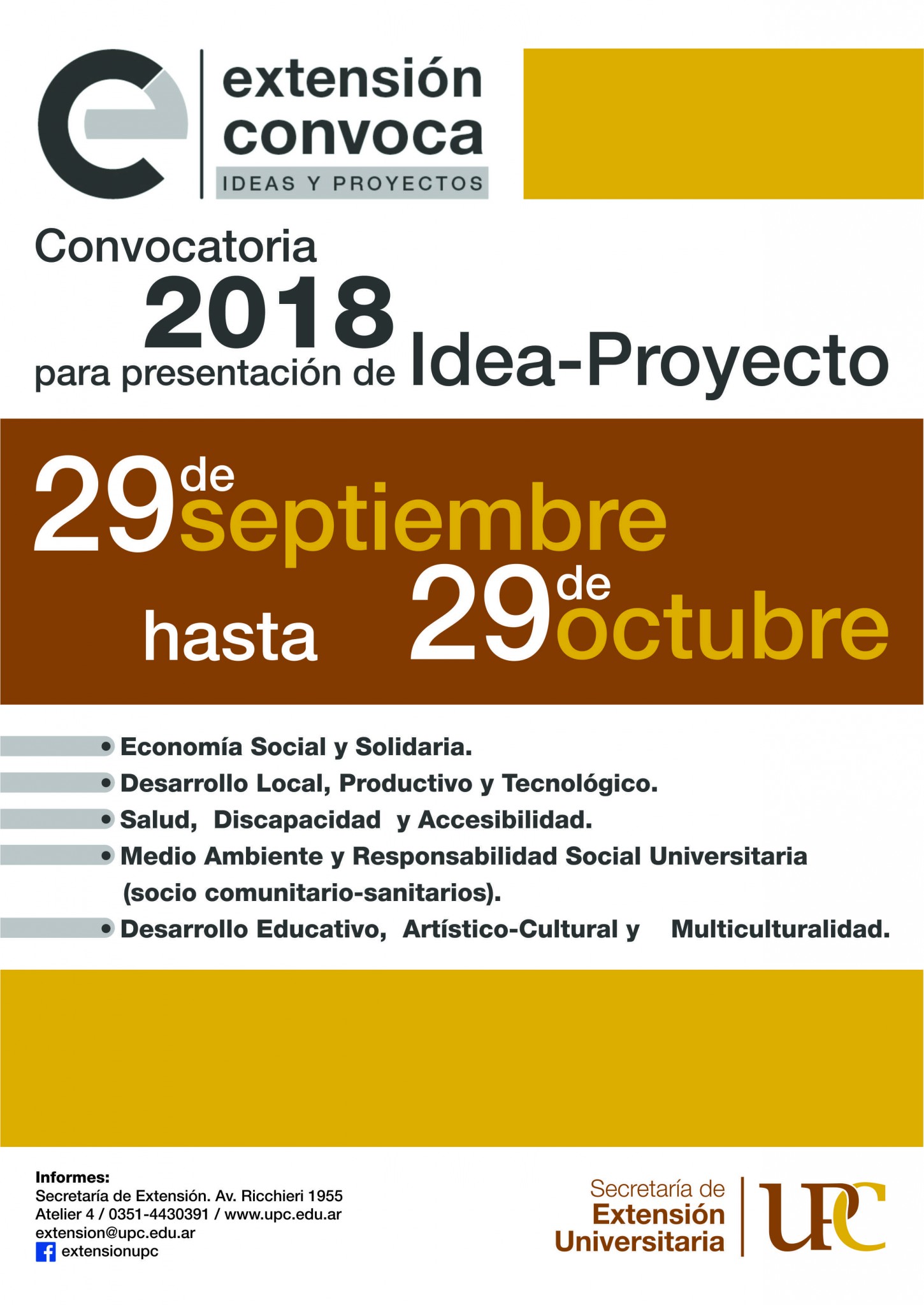 La Secretaria de Extensión de la Universidad Provincial de Córdoba informa que desde el 29 de septiembre hasta el 29 de octubre del corriente año, estará abierta la Convocatoria 2018 para presentación de Idea-Proyecto.