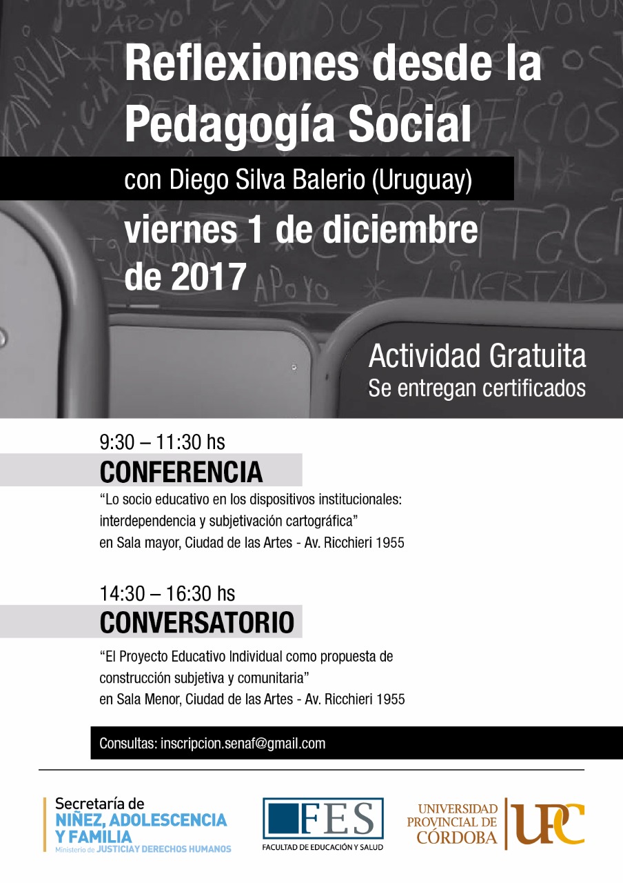 La Jornada constará de dos instancias: de 9:30 a 11:30 tendrá lugar la Conferencia “Lo socioeducativo en los dispositivos institucionales: interdependencia y subjetivación cartográfica” en Sala Mayor, y de 14: 30 a 16:30 en la Sala Menor se realizará el Conversatorio “El Proyecto Educativo individual como propuesta de construcción subjetiva y comunitaria”.
