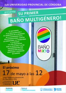 La Universidad Provincial de Córdoba, desde el Centro Universitario de Estudios Sociales y la Secretaría de Extensión y Relaciones Institucionales, inaugurará el próximo jueves su primer baño multi-géneros en el marco del 17 de mayo: Día Provincial por la Igualdad y la no discriminación por Orientación Sexual, Identidad y Expresión de Género y Día Internacional contra la Homofobia, la Transfobia y la Bifobia.