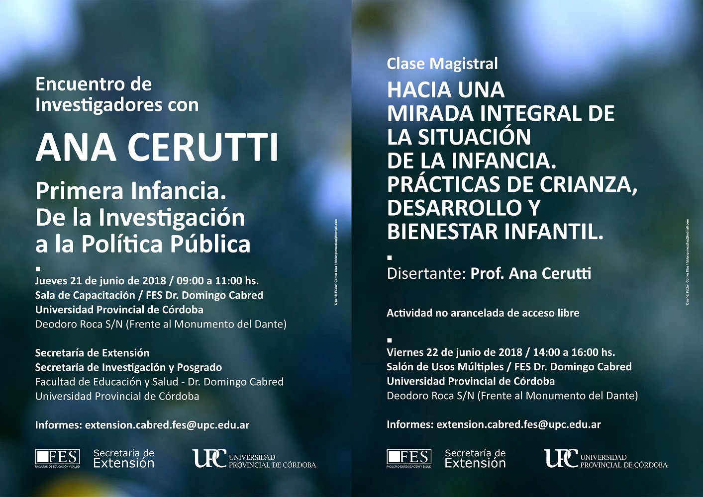 Asimismo Cerutti realizará una Clase Magistral el viernes 22 de junio de 14 a 16:30 bajo el título: Hacia una mirada integral de la situación de la infancia. Prácticas de crianza, desarrollo y bienestar infantil. Esta instancia tendrá lugar en la Facultad de Educación y Salud (Salón de Usos Múltiples / Dr. Domingo Cabred). Actividad no arancelada de acceso libre.