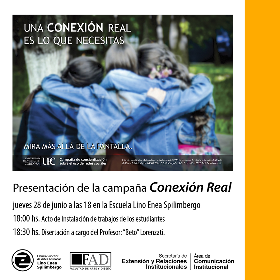 Les invitamos a participar de la Presentación de la campaña Conexión Real de concientización sobre el uso de Redes Social realizada por un grupo de estudiantes de la carrera Tecnicatura Superior en Diseño Gráfico y Publicitario, en la materia Deontología Profesional a cargo del profesor «Beto» Lorenzati.