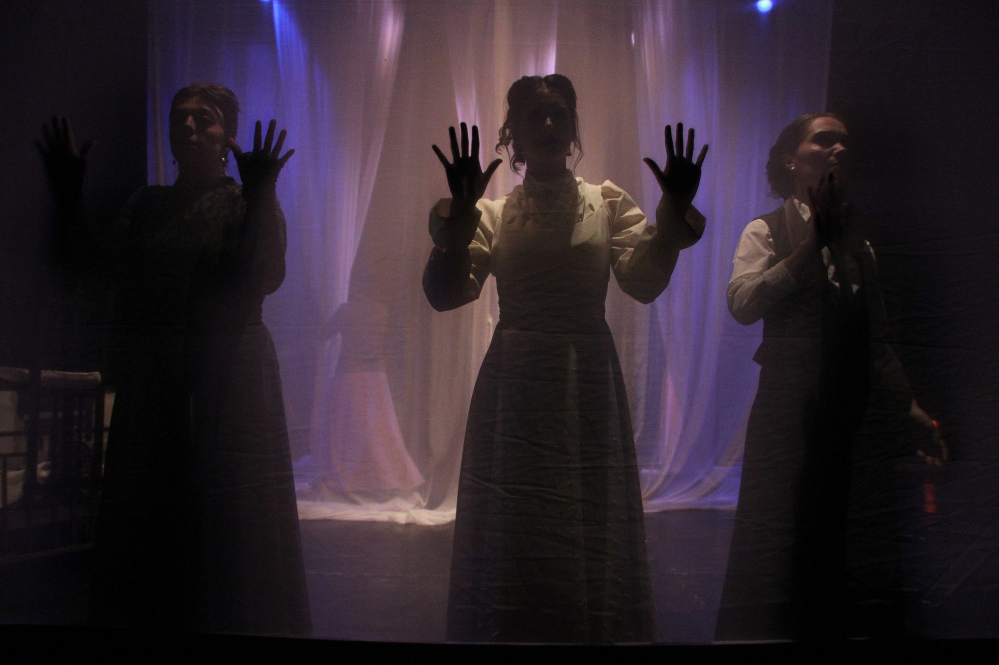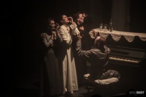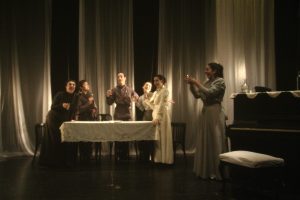 En esta versión libre de Las Tres Hermanas se recrea el universo chejoviano a través de algunos elementos del lenguaje cinematográfico, de allí que el dispositivo escénico es una pantalla traslúcida, un sistema de sonido estéreo y una planta de luces específica que trazan un nuevo subgénero que podemos denominar “film teatral”.