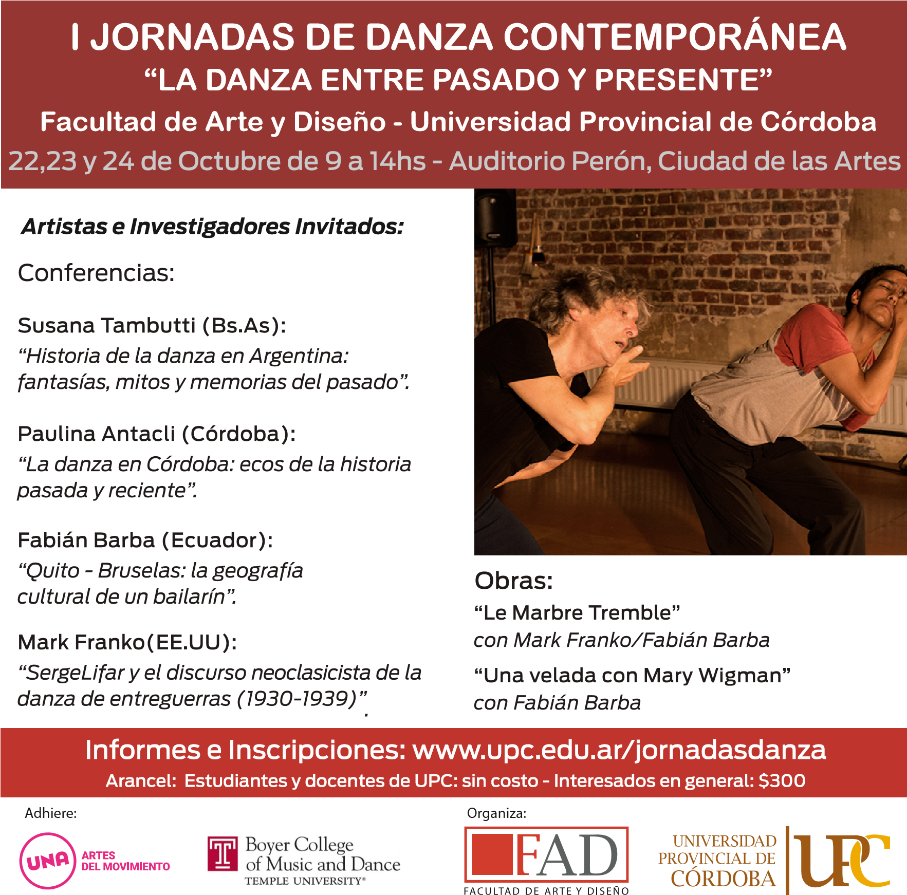 Las jornadas contarán con conferencias de Susana Tambutti (Buenos Aires), Paulina Antacli (Córdoba), Fabian Barba (Ecuador) y Mark Franko (EE.UU.). Asimismo, se presentarán las obras “Le Marbre Tremble” (Mark Franko/ Fabian Barba) y “Una velada con Mary Wigman” (Fabian Barba).