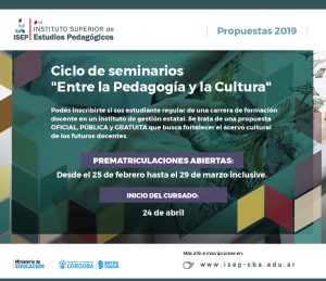 El Ciclo “Entre la Pedagogía y la Cultura” es un conjunto de seminarios que se proponen contribuir a la formación de grado de quienes se han decidido por la profesión docente, acrecentando el acervo cultural de los futuros profesores y las futuras profesoras de la provincia de Córdoba.