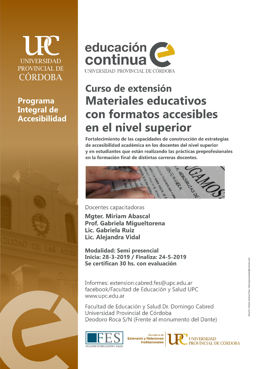 La Facultad de Educación y Salud junto a la Secretaría de Extensión y Relaciones Institucionales invitan a participar del Curso de extensión: Materiales educativos con formatos accesibles en el nivel superior que se desarrolla en el marco del Programa Integral de Accesibilidad de nuestra casa de estudios.