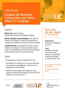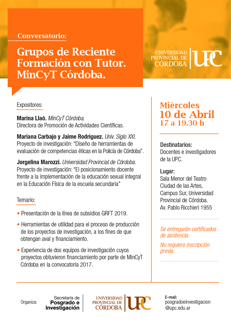 La Secretaría de Investigación y Posgrado de la Universidad Provincial de Córdoba invita a participar del Conversatorio: Grupos de Reciente Formación con Tutor (MinCyT Córdoba).