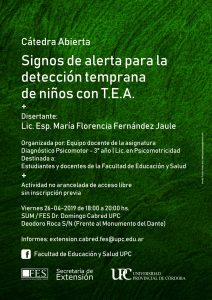 Los Trastornos del Espectro Autista son cada vez más frecuentes en nuestra población. Es importante y necesario que los diferentes profesionales de los equipos de salud que trabajan con niños, estén formados para detectar aquellos signos de alarma en el Neurodesarrollo, y así posibilitar su atención y abordaje temprano en pos de promover su mejor desarrollo y calidad de vida.