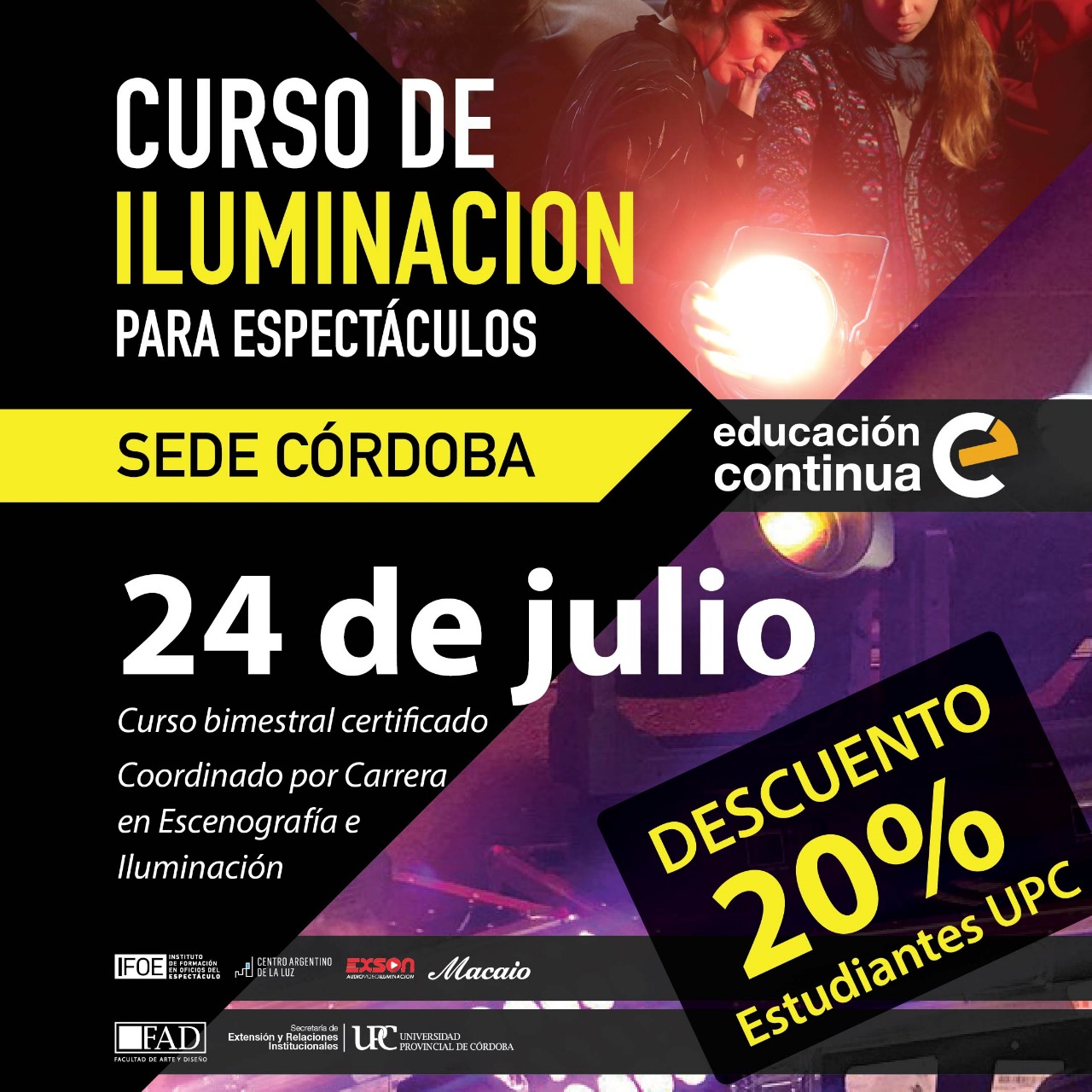 Durante el cursado se abordarán gran variedad de contenidos como manejo de consolas, señales de control, luminotecnia y el funcionamiento de las luminarias.