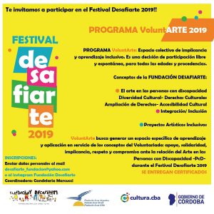 Voluntarte busca generar un espacio específico de aprendizaje y aplicación en servicio de los conceptos del voluntariado: apoyo, solidaridad, implicancia, respeto y compromiso ante la relación del Arte en las Personas con Discapacidad durante el Festival Desafiarte 2019.