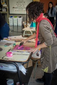 Los alumnos y alumnas de la escuela tuvieron la oportunidad de ver una línea de producción seriada en Indumentaria y aprendieron la técnica serigráfica mediante el estampado del símbolo de la Paz, luego se llevaron de regalo los pañuelos confeccionados por ellos mismos.