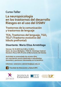 La Secretaría de Extensión de la Facultad de Educación y Salud invita al Curso-Taller: La neuropsicología en los trastornos del desarrollo. Riesgos en el uso del DSMV. Trastornos de la comunicación y trastornos de lenguaje. TEA, Trastornos del lenguaje, TGD, TELF (Trastorno evolutivo del lóbulo prefrontal), a cargo de María Elisa Arrebillaga.