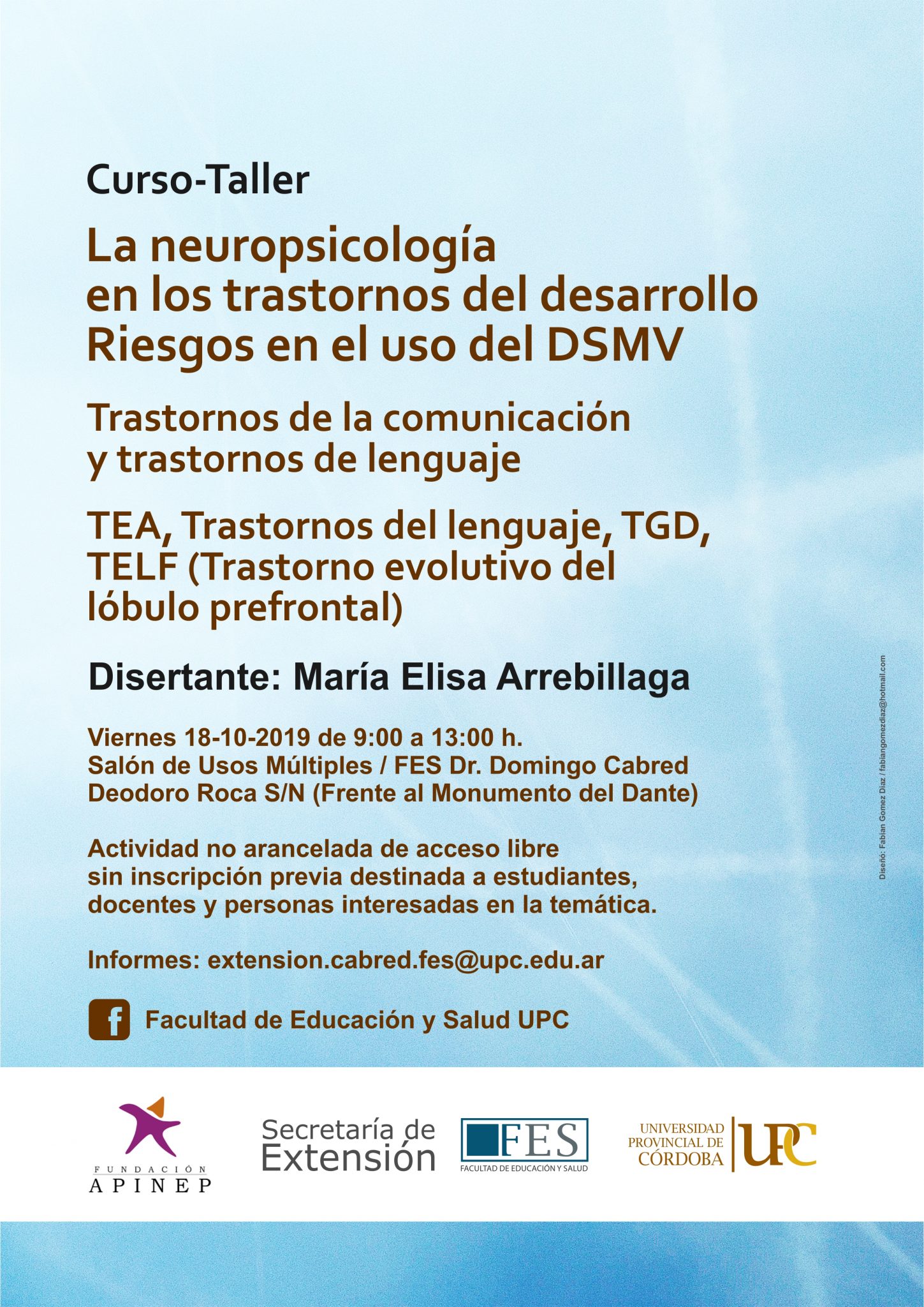 La Secretaría de Extensión de la Facultad de Educación y Salud invita al Curso-Taller: La neuropsicología en los trastornos del desarrollo. Riesgos en el uso del DSMV. Trastornos de la comunicación y trastornos de lenguaje. TEA, Trastornos del lenguaje, TGD, TELF (Trastorno evolutivo del lóbulo prefrontal), a cargo de María Elisa Arrebillaga.