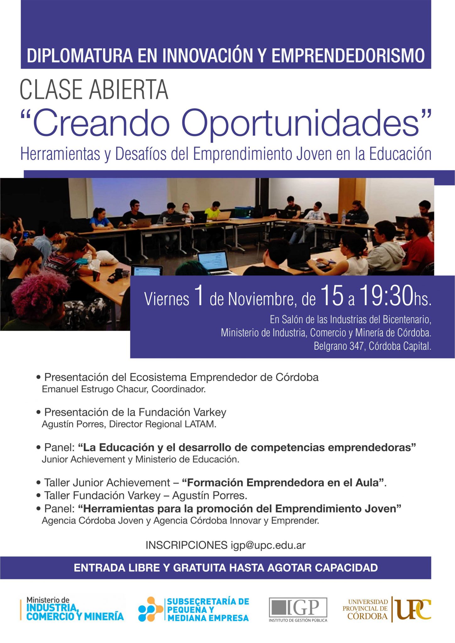 El Instituto de Gestión Pública de la Universidad Provincial de Córdoba invita a participar de la clase abierta: «Creando Oportunidades. Herramientas y desafíos del emprendimiento joven en la educación» que se realiza en el marco de la Diplomatura en Innovacion y Emprendedorismo.