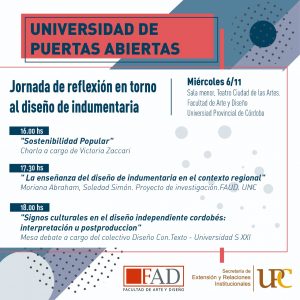 Durante el encuentro se desarrollarán charlas sobre Sostenibilidad Popular, la enseñanza del diseño de indumentaria en el contexto regional y los Signos culturales en el diseño independiente cordobés.
