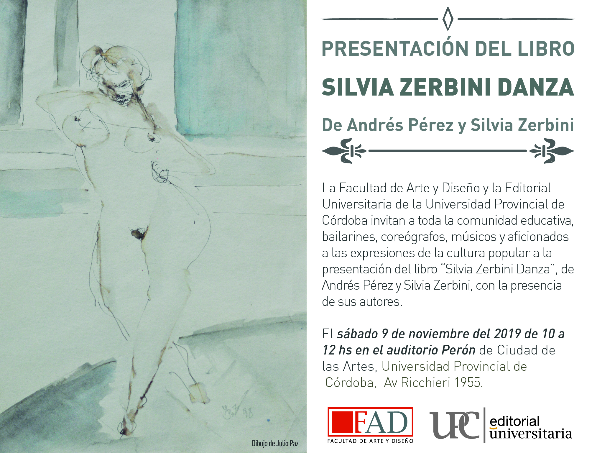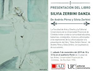 La Facultad de Arte y Diseño de la UPC junto con la Secretaría de Extensión y Relaciones Institucionales de la Universidad Provincial de Córdoba invitan a toda la comunidad educativa, bailarines, coreógrafos, músicos y aficionados a las expresiones de la cultura popular a la presentación del libro “Silvia Zerbini Danza”, de Andrés Pérez y Silvia Zerbini, con la presencia de sus autores.