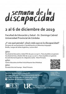 La Facultad de Educación y Salud de la Universidad Provincial de Córdoba te invita a participar de las actividades que se desarrollarán en el marco de la Semana de la Discapacidad, 2 al 6 de diciembre.