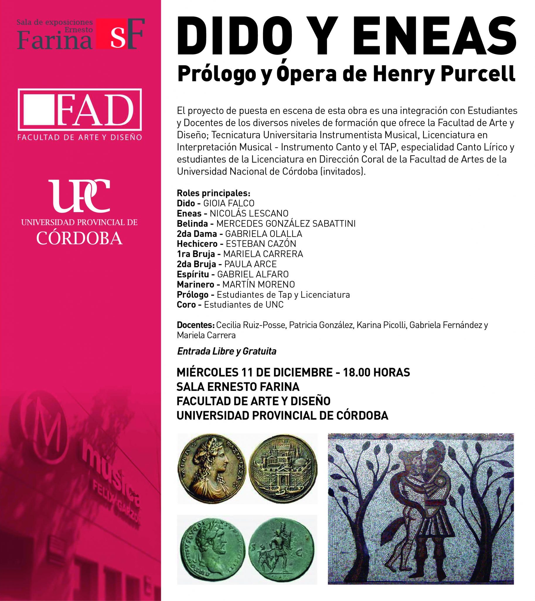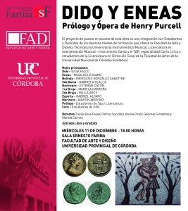 La Facultad de Arte y Diseño de la Universidad Provincial de Córdoba invita a la presentación  de Dido y Eneas, una puesta en escena de estudiantes y docentes que se podrá observar con entrada libre y gratuita el 11 de diciembre a las 18 en la Sala Farina, en diálogo con la muestra de Instalaciones que está montada en este momento.