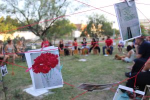 Familiares, amigos/as, miembros de la comunidad educativa y participantes de talleres del Espacio de Participación Cultural de la FES, estudiantes del PIT del IPEM 270 Manuel Belgrano y el grupo de tamboreros/as La Tupac, recordaron a Leonor y a Nélida, con palabras, música y poesía.