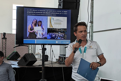La UPC formó parte del panel Desarrollo del deporte universitario y el rol de los estudiantes. Esteban de la Rosa, coordinador del Programa Deporte, Actividad Física y Recreación: un lugar de encuentro de la UPC, disertó sobre el funcionamiento del programa y sobre el crecimiento de los Juegos Universitarios Cordobeses (JUC), los cuales son organizados por la UPC y cuentan con el apoyo de FEDuA y la Agencia Córdoba Deportes. El profesor De la Rosa hizo especial referencia a la incorporación de tres nuevas categorías en los juegos: deporte adaptado (natación, atletismo y tenis de mesa), jubilados (natación) y docentes (natación y tenis). Cabe destacar que la UPC obtuvo la distinción, por parte de la FeDUA, al Mejor proyecto de promoción del deporte universitario por su labor en los Juegos Universitarios Cordobeses 2019.