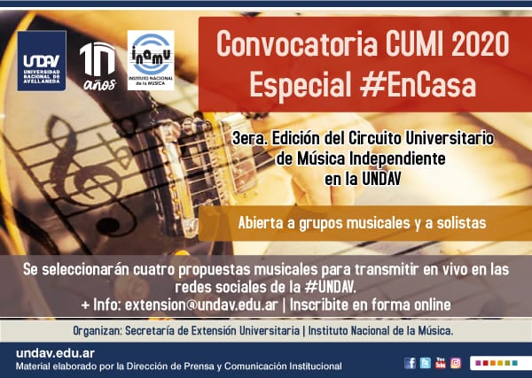 La Universidad Provincial de Córdoba informa que se encuentran abiertas las inscripciones para la Tercera Edición del Circuito Universitario de Música Independiente (CUMI) de la Universidad Nacional de Avellaneda (UNDAV).