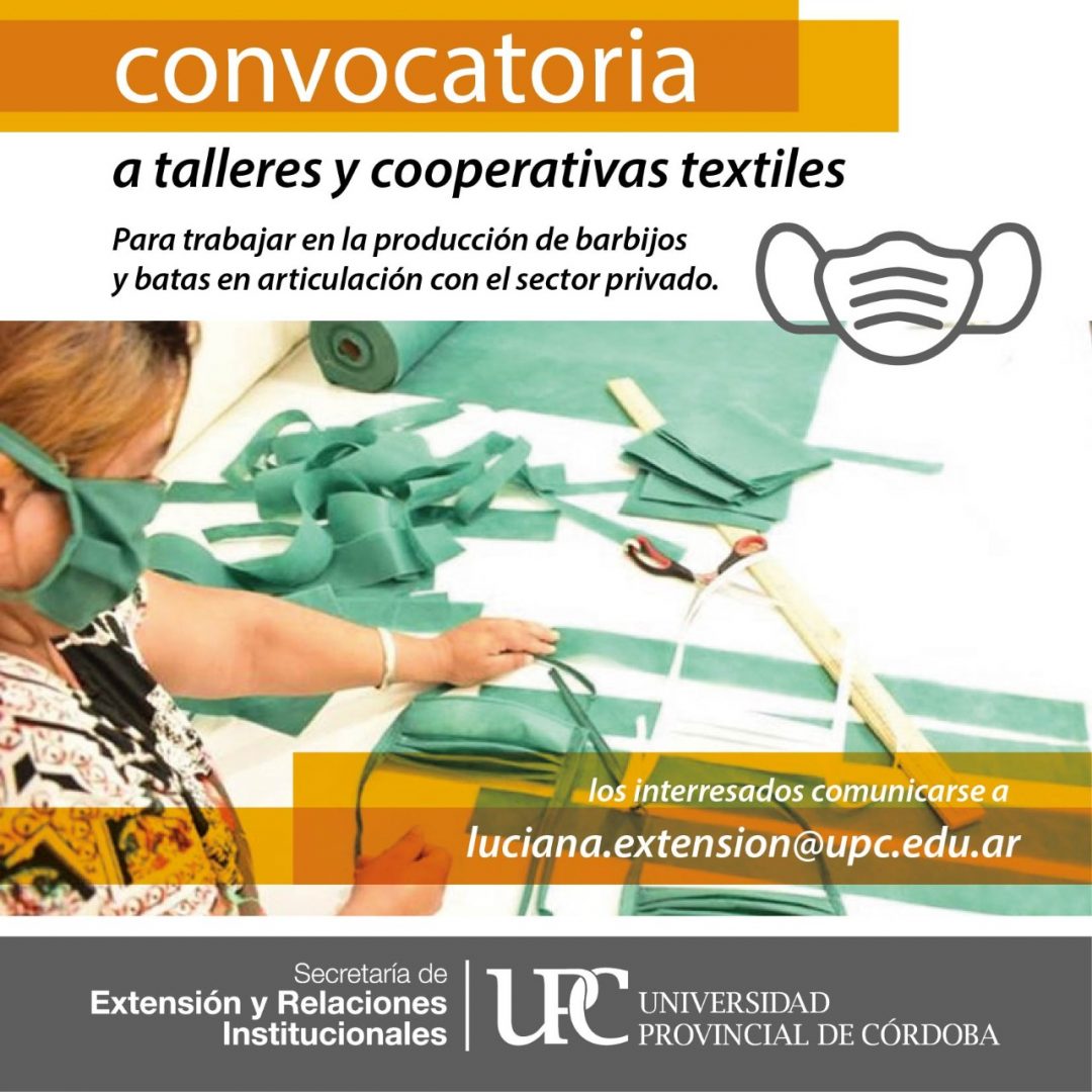 La Secretaría de Extensión y Relaciones Institucionales de la Universidad Provincial de Córdoba invita a participar de la convocatoria dirigida a talleres y cooperativas textiles para trabajar en la producción de barbijos y batas en articulación con fabricantes especializados en la materia.