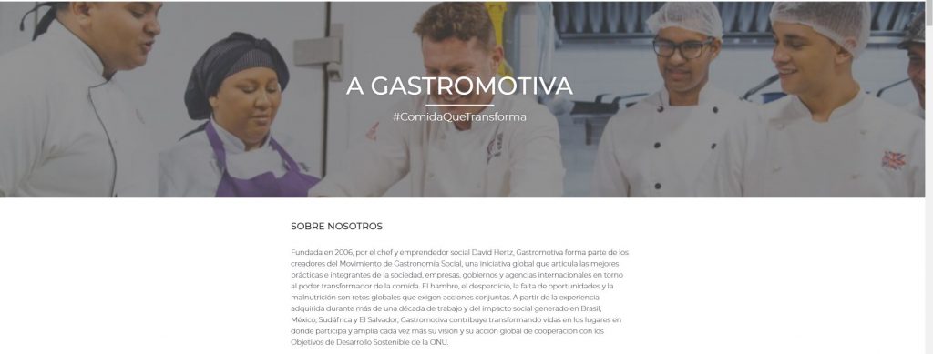 Fundada en 2006 por el chef y emprendedor social brasileño David Hertz, Gastromotiva ha transformado vidas en Brasil, México, Sudáfrica y El Salvador durante más de una década. Trabajando con los Objetivos de Desarrollo Sostenible de la ONU, utiliza el poder transformador de los alimentos para conectar a personas, proyectos, empresas, universidades, agencias internacionales, gobiernos y la sociedad civil para combatir el hambre, el desperdicio, la falta de oportunidades, la obesidad y la desnutrición.