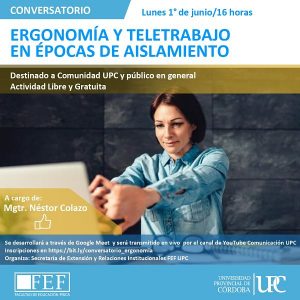 La Facultad de Educación Física de la Universidad Provincial de Córdoba (UPC) invita a toda su comunidad educativa y al público interesado, al conversatorio Ergonomía y Teletrabajo en épocas de  aislamiento” que se realizará el próximo lunes 1º  de junio a las 16 horas, vía Google Meet.