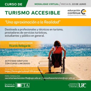 La Secretaría de Extensión de la Facultad de Turismo y Ambiente «Marcelo Montes Pacheco» de la Universidad Provincial de Córdoba, invita a participar del Curso Turismo Accesible, una aproximación a la realidad, destinado a Licenciados y Técnicos en Turismo; Guías de Turismo, Coordinadores de viajes: y toda aquella persona que brinde servicios turísticos. También a estudiantes y público en general.
