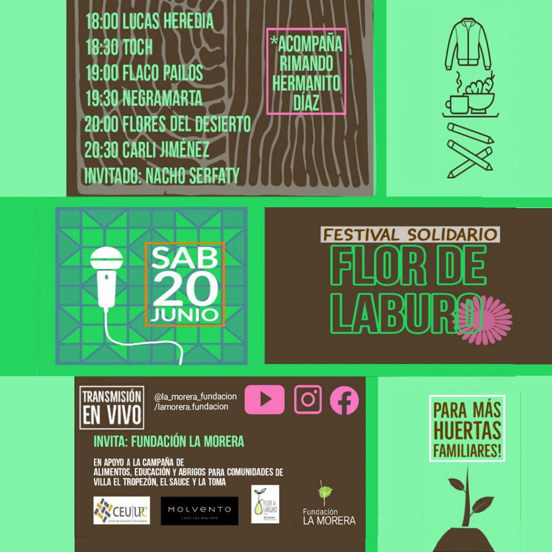 Flor de Laburo es un trabajo de gestión asociada entre Fundación la Morera, el Centro de Extensión de la Universidad Provincial de Córdoba y la empresa Molvento. Con colaboración del INTA de Córdoba.