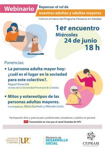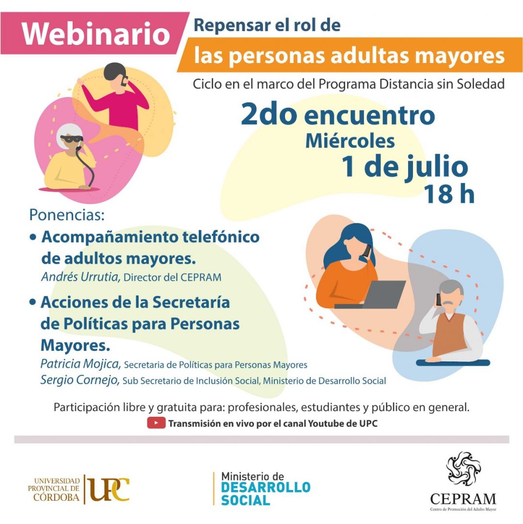 La Secretaría de Extensión y Relaciones Institucionales de la Universidad Provincial de Córdoba te invita a participar del segundo encuentro del Webinario: Repensar el rol de las personas adultas mayores.