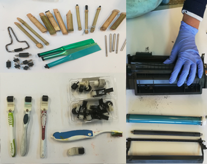 «Cuando los trabajos prácticos comenzaron a requerir entintado, escuchamos a los alumnos manifestar que sus rodillos habían quedado en los placares de la Institución, o no tenían. Gracias a la experiencia de otros años realizando reciclado de cartuchos de tóner, desarmando fotocopiadoras o impresoras láser en desuso, construimos un material específico y didáctico para que los alumnos puedan tomar ejemplos y cada uno realizar una experiencia de fabricar su rodillo casero.»
