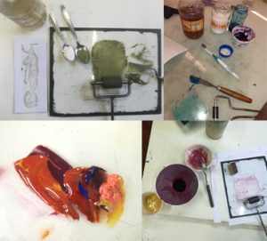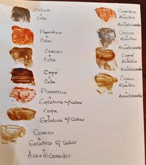 «Otro inconveniente de la cuarentena, fue poder adquirir tintas. Considerando esto, armamos clases en con una descripción de cómo elaborar tintas, con materiales accesibles, es decir, aquellos que tuvieran en su hogar. Las mismas,-en su mayoría-, fueron realizadas con una base aglutinante de miel o aceite, pigmentos naturales, reciclados o de origen mineral y espesantes coma la fécula de maíz o arroz.»