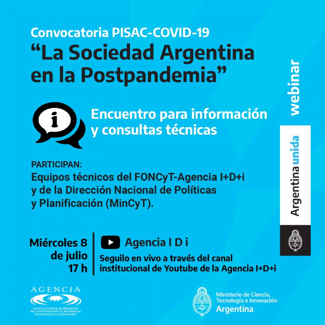 En el marco de la Convocatoria PISAC-COVID-19 «La Sociedad Argentina en la Postpandemia se realizará un webinario para brindar más información y consultas técnicas.Se realizará el miércoles 8 de julio a las 17 en vivo a través del canal de Youtube de la Agencia I+D+i. Participaran equipos técnicos del FONCyT-Agencia I+D+i y de la Dirección Nacional de Políticas y Planificación.