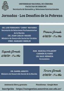 Estas jornadas se llevarán a cabo los días 4, 6 y 11 de agosto de 2020 y contarán con la presencia del Dr, Luis Fernando »Chino» Navarro (Secretario de Relaciones Parlamentarias de la Nación), Dr. Juan Carlos Massei (Ministro de Desarrollo Social de Córdoba) Pbro. Mariano Oberlin, Rab. Marcelo Polakoff, Carmen Álvarez, Dr. Raúl Hermida (Economista) y del Dr. Daniel Arroyo (Ministro de Desarrollo Social de la Nación).