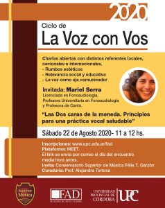 La Universidad Provincial de Córdoba, a través de su Conservatorio Superior de Música Félix T. Garzón (Facultad de Arte y Diseño) invita a participar de una nueva charla abierta del Ciclo de «La Voz con Vos».