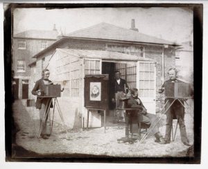 Talbotipo o Calotipo (de la palabra ‘kalos’ o belleza): sistema fotográfico negativo – positivo. Aunque el negativo era en papel, el resultado visual no se destacó tanto como el daguerrotipo y recién en 1860 comenzó a conocerse. En la imagen, Fox Talbot realizando un talbotipo en 1845, en Reading (Inglaterra).