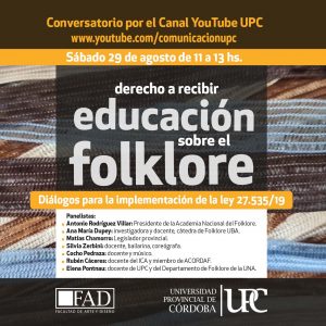 La Facultad de Arte y Diseño de la Universidad Provincial de Córdoba, a través de su Secretaría de Posgrado e Investigación, invita a participar del encuentro por videoconferencia el Derecho a recibir educación sobre el folklore, para dialogar sobre la implementación de la Ley  27.535/19.