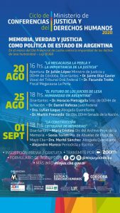 La Universidad Provincial de Córdoba invita al ciclo de conferencias: Memoria, verdad y justicia como política de estado, organizado por el Ministerio de justicia y Derechos Humanos de la provincia y que tendrá su primer encuentro el jueves 20 de agosto a las 16, a través de la plataforma zoom. Se entregarán certificados.