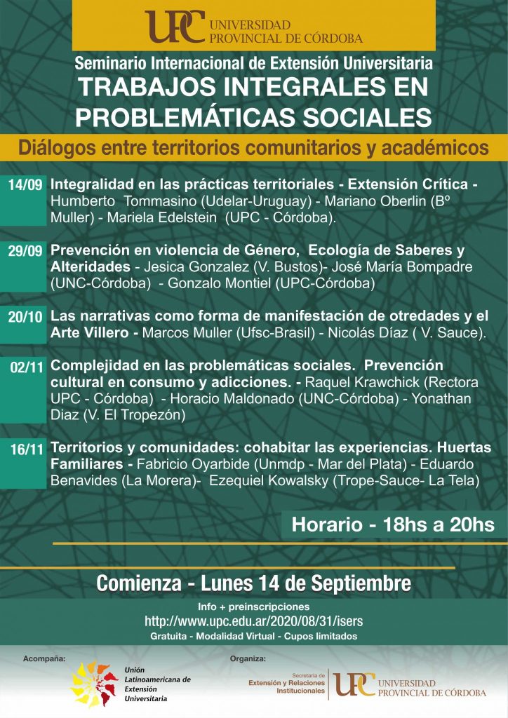 El seminario comienza el lunes 14 de septiembre, es cuatrimestral y tendrá una duración total de 35 h reloj, que se brindará alternando encuentros virtuales con actividades e interacción a través de un Foro de aportes temáticos. Para ver el Programa de los contenidos y cronograma completo click aquí.