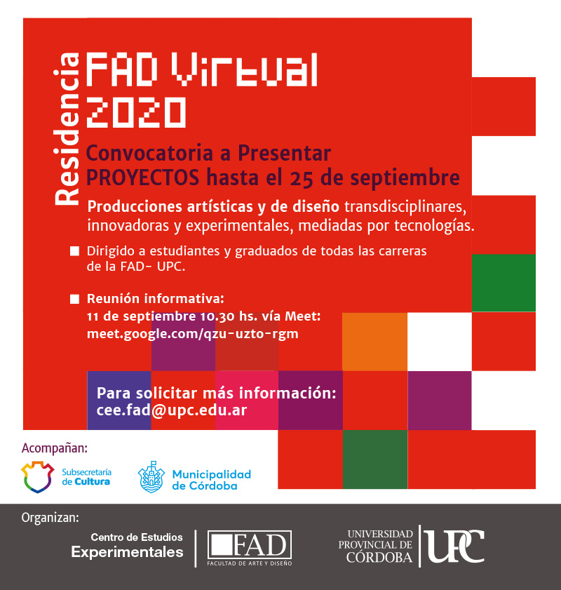 El Centro de Estudios Experimentales de la Facultad de Arte y Diseño de la Universidad Provincial de Córdoba, con el apoyo de la Subsecretaría de Cultura de la Municipalidad de Córdoba, convoca a la primera Residencia FAD Virtual 2020, para estudiantes y egresados de las carreras de artes y diseño de la Facultad de Arte y Diseño- UPC.