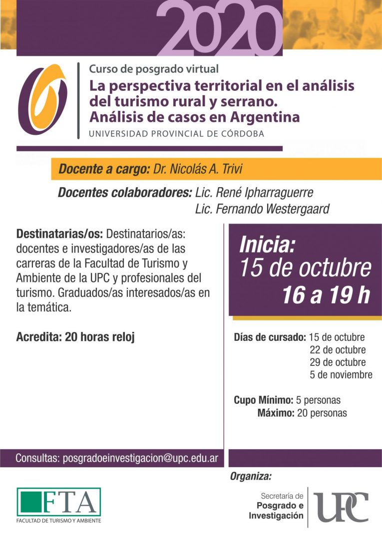 La Secretaría de Posgrado e Investigación de la Universidad Provincial de Córdoba invita participar del Curso de Posgrado: La perspectiva territorial en el análisis del turismo rural y serrano. Análisis de casos en Argentina, a cargo del Dr. Nicolás Trivi con la colaboración del Lic. Roberto René Ipharraguerre y el Lic. Fernando Westergaard.