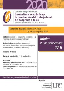 La Secretaría de Posgrado e Investigación y la Facultad de Educación Física de la Universidad Provincial de Córdoba invitan a participar del curso de posgrado “La escritura académica y la producción del trabajo final de posgrado o tesis”.