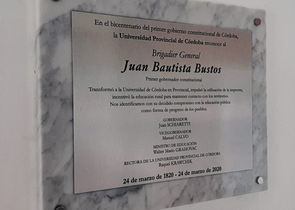 En el bicentenario del primer gobierno constitucional de Córdoba, desde nuestra casa de estudios queremos rendir homenaje al Brigadier General Juan Bautista Bustos, quien fue elegido como Primer Gobernador Constitucional y Democrático de la provincia y que, mediante dos mandatos consecutivos, sentó las bases para la organización del Estado provincial.