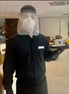 La invitada inicia su presentación definiendo lo que es protocolo como “un conjunto de reglas y procedimientos que solo son efectivos cuando quienes lo implementan lo hacen con precisión y una enorme dedicación y cuidado”. Analía agrega que en el hotel han “preparado” a sus “equipos con las herramientas técnicas” tanto como “con la concientización, de vital importancia para ser exhaustivos en cada detalle” y que los guía “una sana obsesión por multiplicar los procesos de higiene y desinfección, una y otra vez”. Junto a su presentación muestra una foto del mozo del hotel en el salón desayunador ataviado con barbijo y máscara.