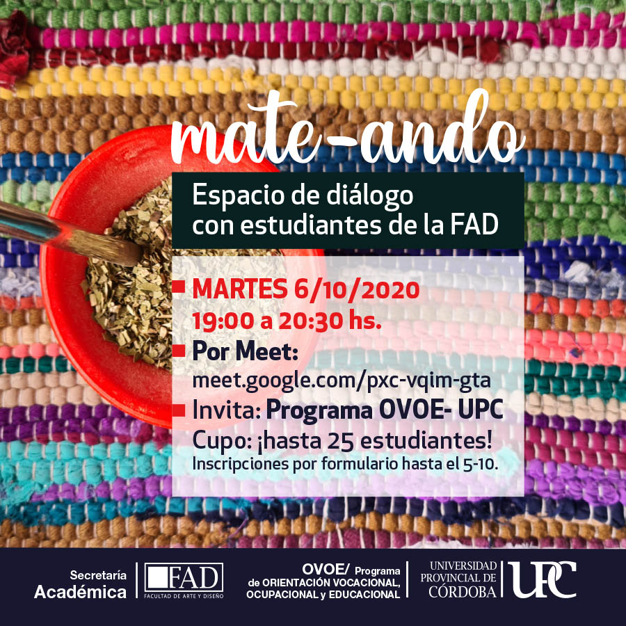 Desde la Secretaría Académica de la Facultad de Arte y Diseño junto con el Programa OVOE: Orientación Vocacional Ocupacional y Educativa de la Universidad Provincial de Córdoba, se abre un espacio de diálogo y escucha para estudiantes de la FAD.