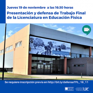 El próximo jueves 19 de noviembre a las 16:30, se realizará la presentación y defensa del Trabajo Final de la Licenciatura en Educación Física titulado Relación entre el salto unipodal multidireccional y la resistencia aeróbica en basquetbolistas jóvenes.