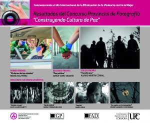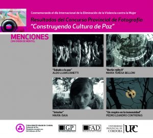 En conmemoración del día Internacional de la Eliminación de la Violencia contra la Mujer, la cátedra Abierta “Derecho a la Paz y  convivencia en la diversidad” y la Coordinación de Gestión y Producción Artística y Diseño de la FAD- UPC, dan a conocer los resultados del Concurso Provincial de Fotografía “Construyendo Cultura de Paz” cuyo lanzamiento se realizó en el marco de la “Semana de la Paz, del 21 al 27 de septiembre del 2020.