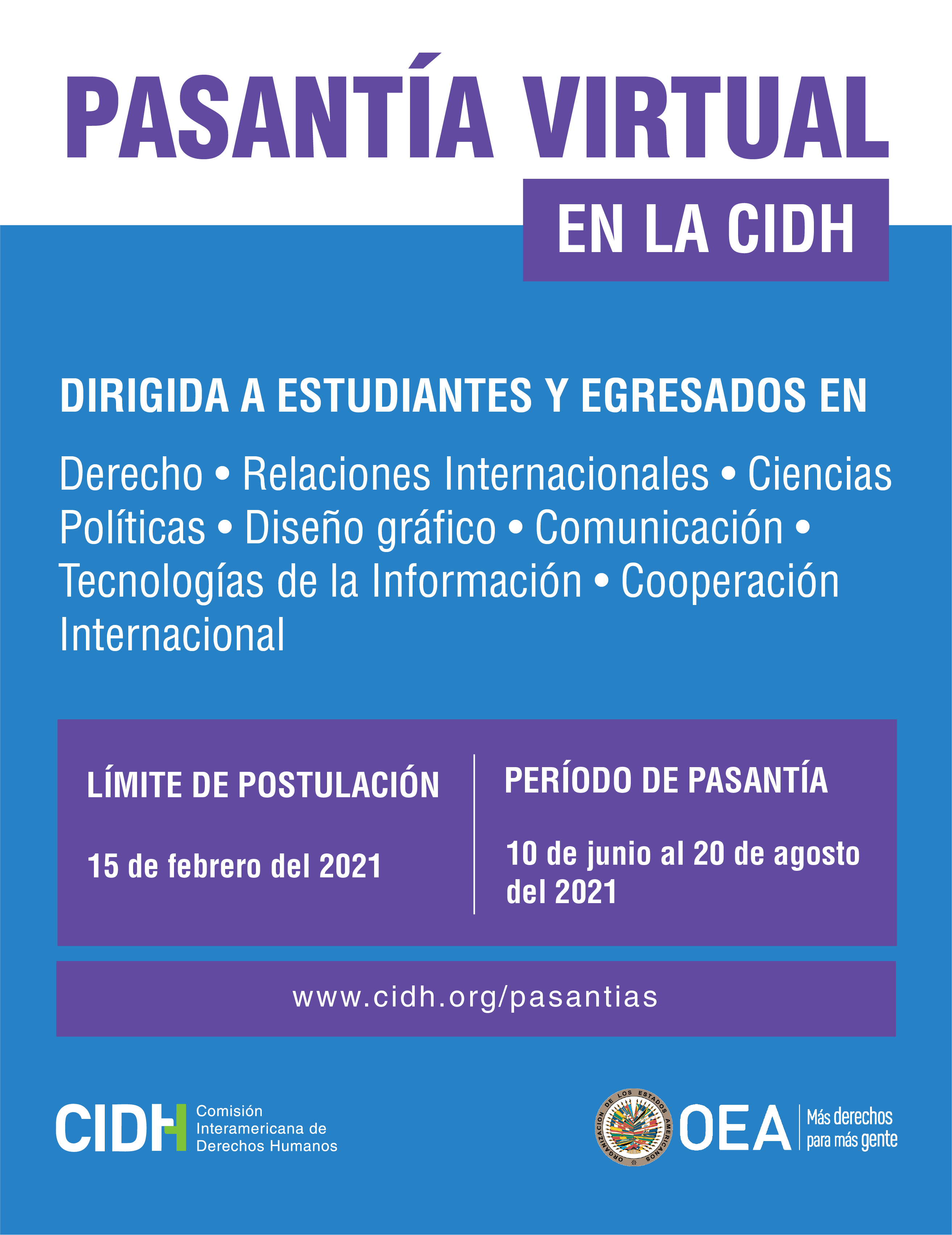 La CIDH tiene oportunidades para jóvenes estudiantes derecho, relaciones internacionales, ciencias políticas, diseño gráfico, comunicación, tecnologías de la información, cooperación internacional, o personas recientemente graduadas en estas áreas.