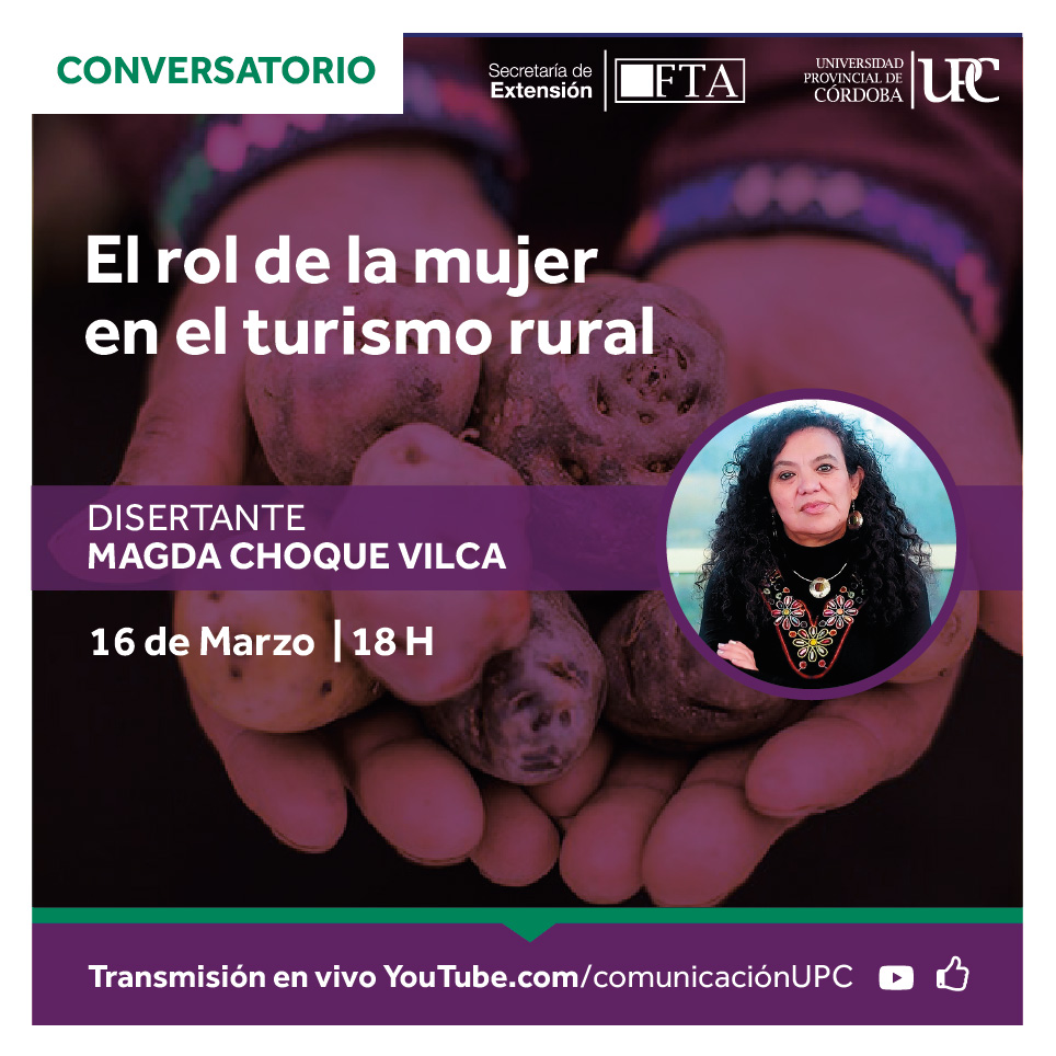 En el marco de la celebración del mes de la mujer, desde la Secretaría de Extensión de la Facultad de Turismo y Ambiente de la Universidad Provincial de Córdoba les invitamos a participar del conversatorio «El rol de la mujer en el turismo rural» a cargo de Magda Choque Vilca.